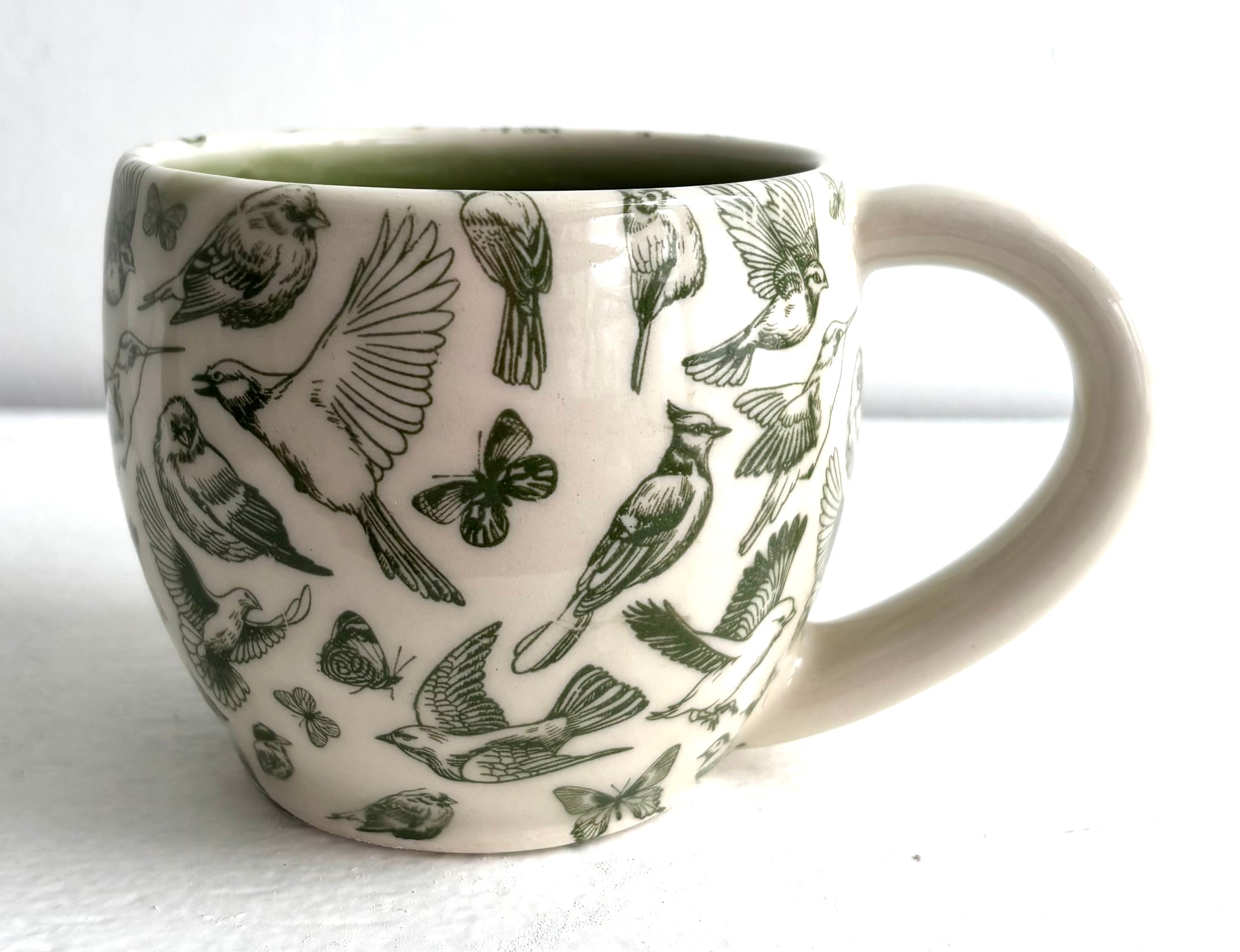 If you love a hand made pottery mug, you will love mine! I make my mugs out of a white porcelain clay body. I throw them on the potter's wheel, trim the bottoms with a foot ring so the bottoms are glazed as well. Each handle has been pulled and attached to the cup individually, so each cup has great character. Almost all of my handles are designed for two normal sized fingers. The exterior decoration is a transfer technique which is a silkscreening technique. The patterns are sealed permanently into the clay by the glazing process. A clear glaze is over the exterior, a soft green liner glaze cheers you up.