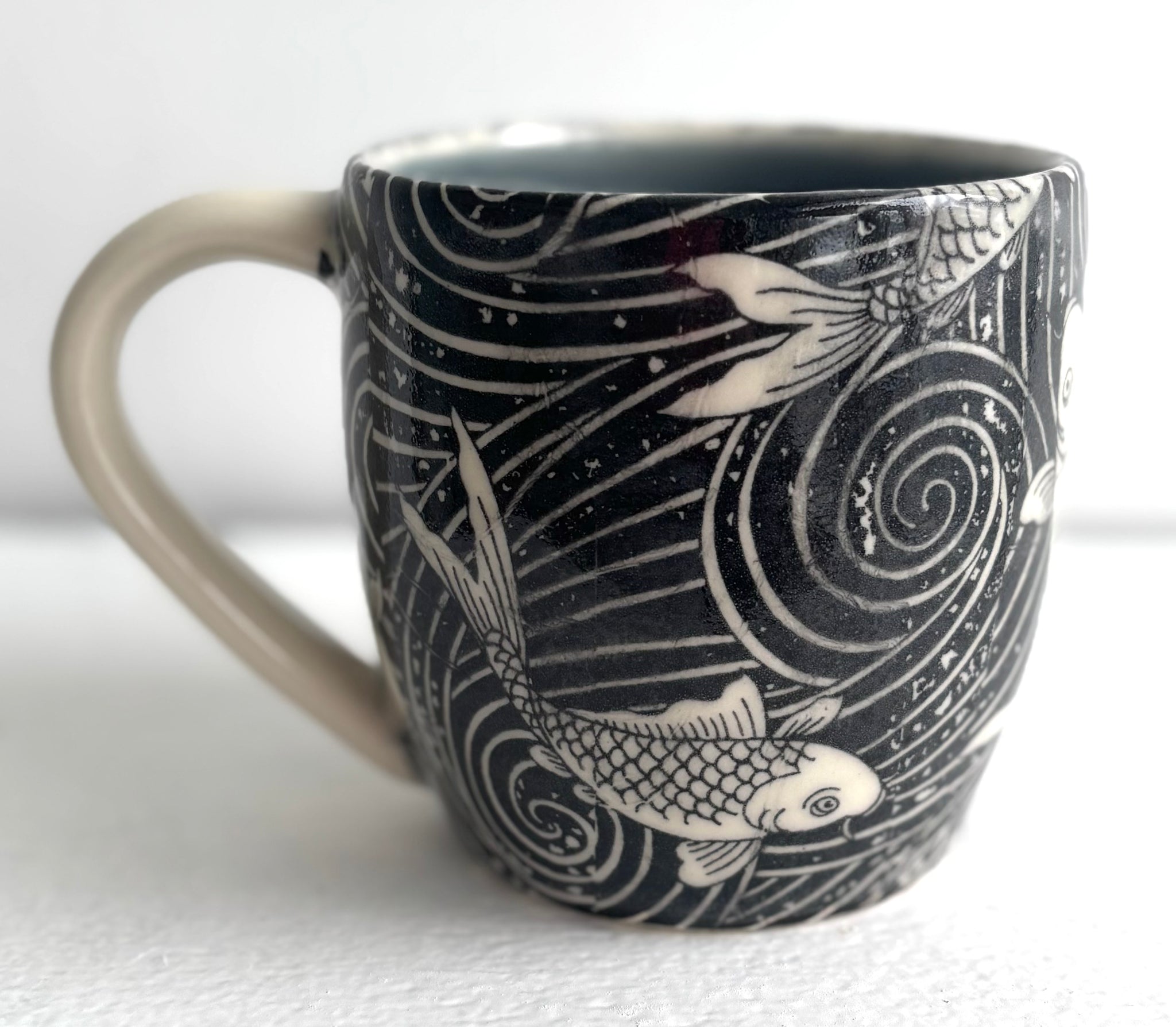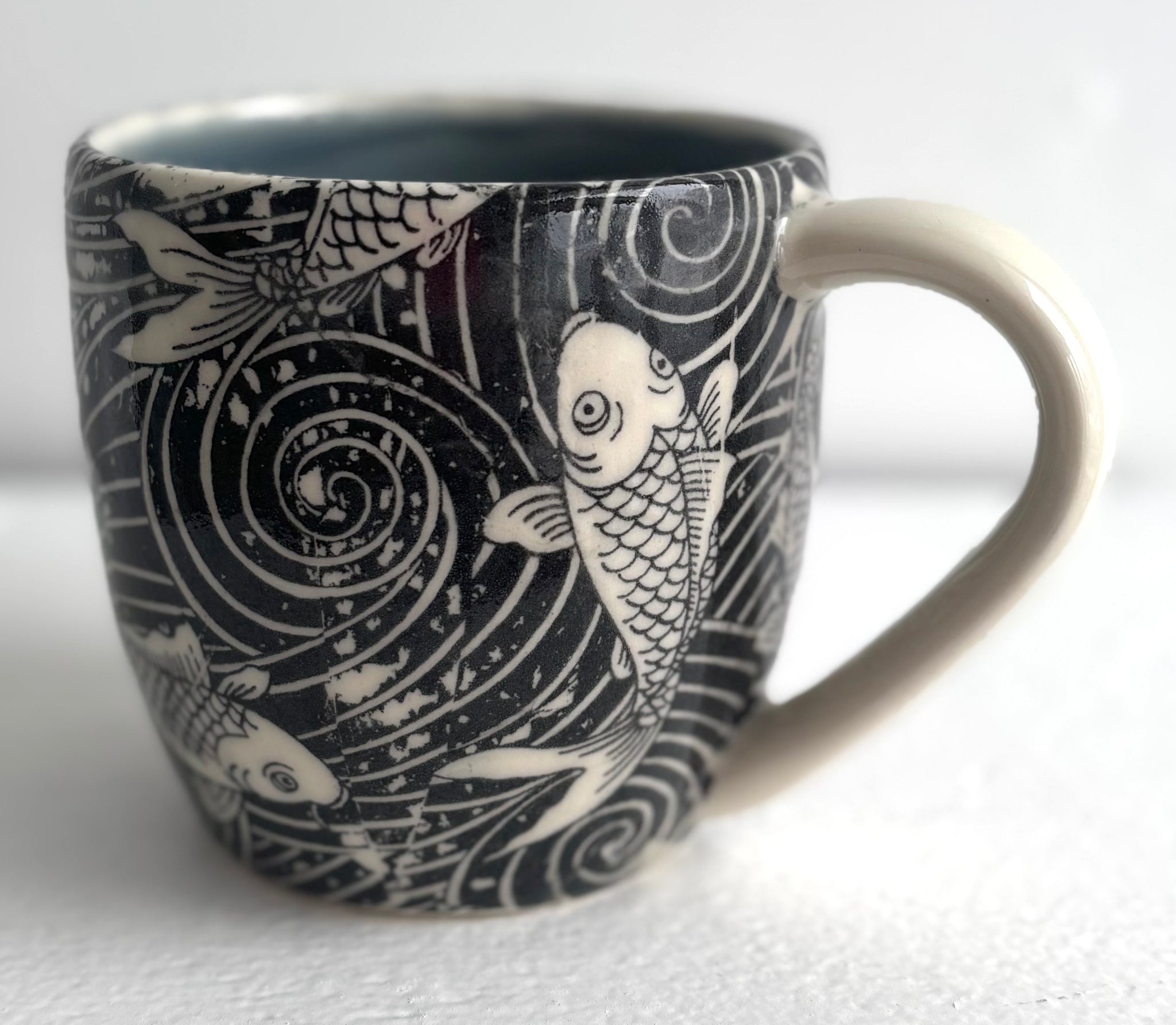 Porcelain Pottery Mug with Koi in Swirling Water Blue Liner