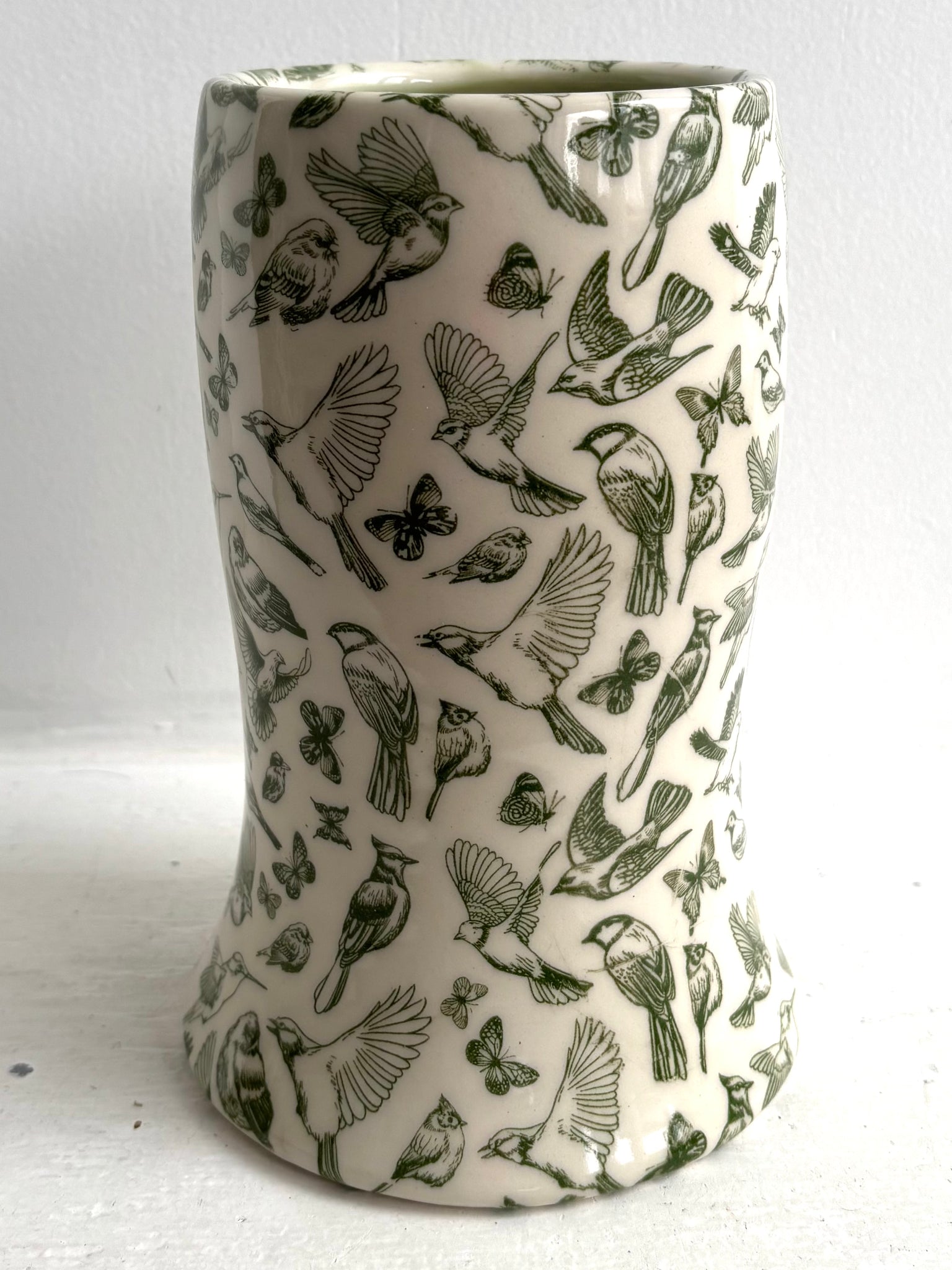A lovely vase whose shape suggests the art deco movement. I made this out of a white porcelain clay body. I threw it on the potter's wheel, trimmed the bottom with a foot ring so the bottom is glazed as well. The exterior decoration is a transfer technique which is a silkscreening technique in green birds and bees. It is a sweet pattern and fun for bird lovers.