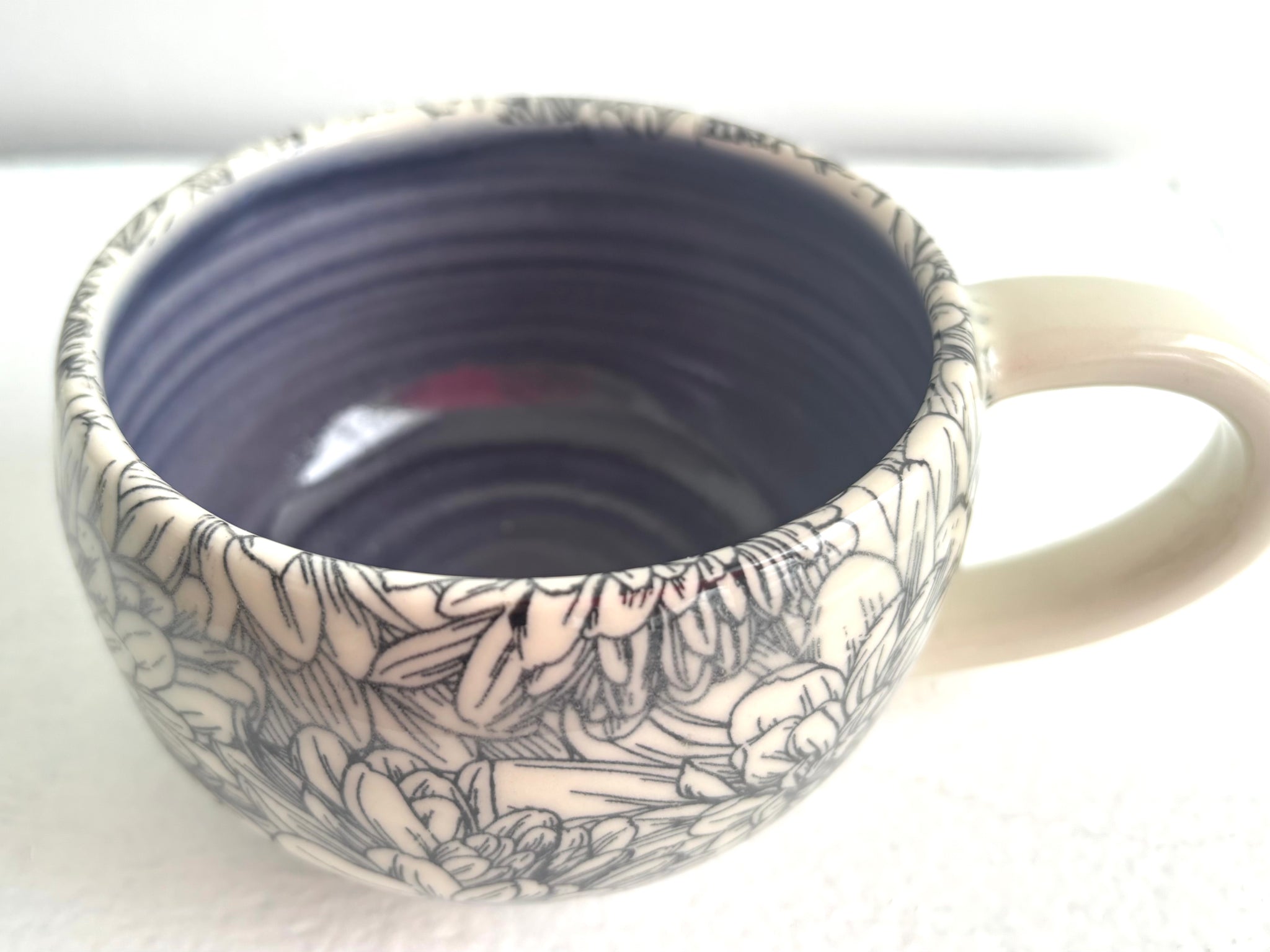 I make my mugs out of a white porcelain clay body. I throw them on the potter's wheel, trim the bottoms with a foot ring so the bottoms are glazed as well. Each handle has been pulled and attached to the cup individually, so each cup has great character. The exterior decoration is a transfer technique which is a silkscreening technique. The patterns are sealed permanently into the clay by the glazing process. A clear glaze is over the exterior, a coloured liner glaze cheers you up. Please appreciate the slight variations and imperfections that are the signs of hand made pottery.