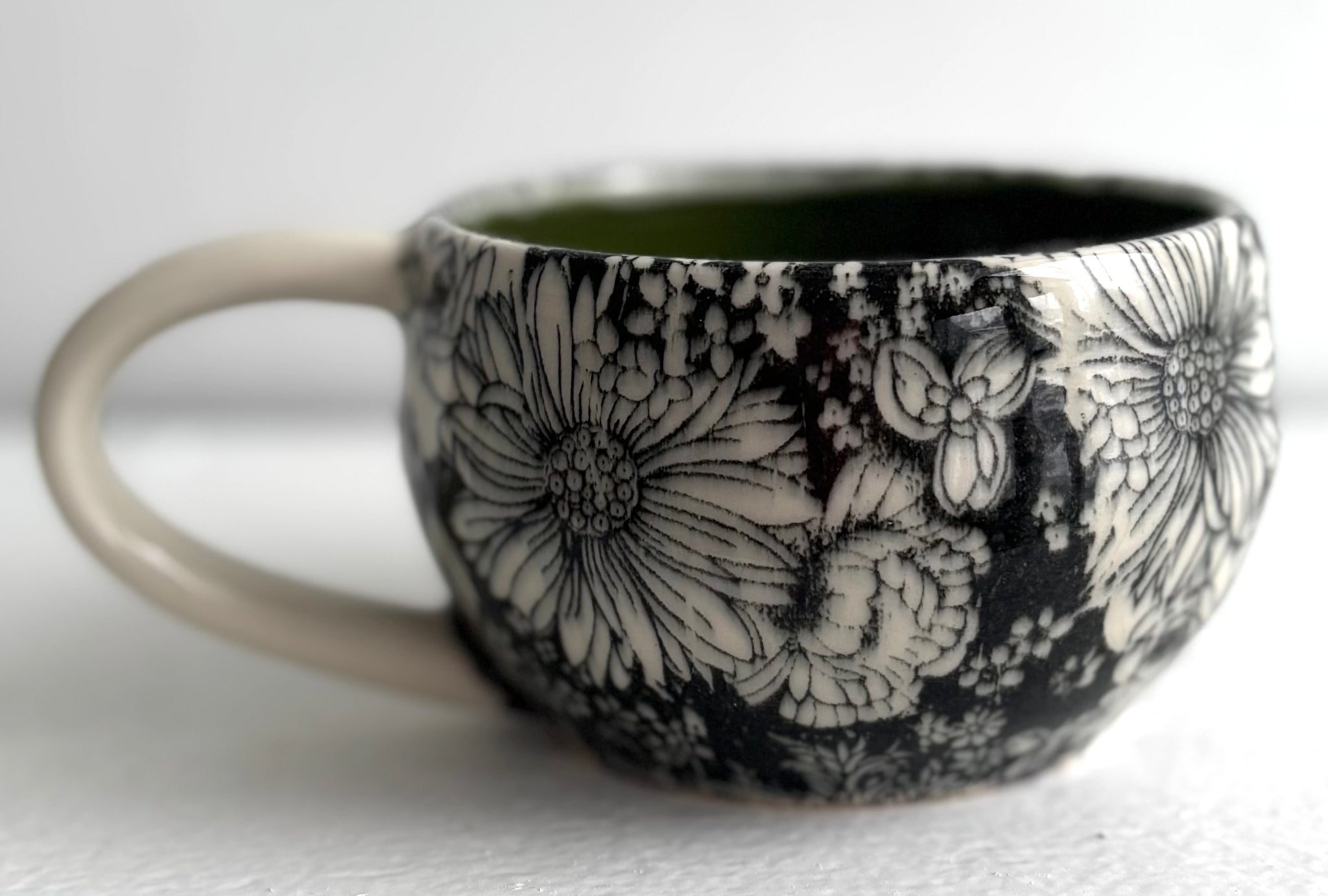 I make my mugs out of a white porcelain clay body. I throw them on the potter's wheel, trim the bottoms with a foot ring so the bottoms are glazed as well. Each handle has been pulled and attached to the cup individually, so each cup has great character. The exterior decoration is a transfer technique which is a silkscreening technique. The patterns are sealed permanently into the clay by the glazing process. A clear glaze is over the exterior, a coloured liner glaze cheers you up. Please appreciate the slight variations and imperfections that are the signs of hand made pottery.