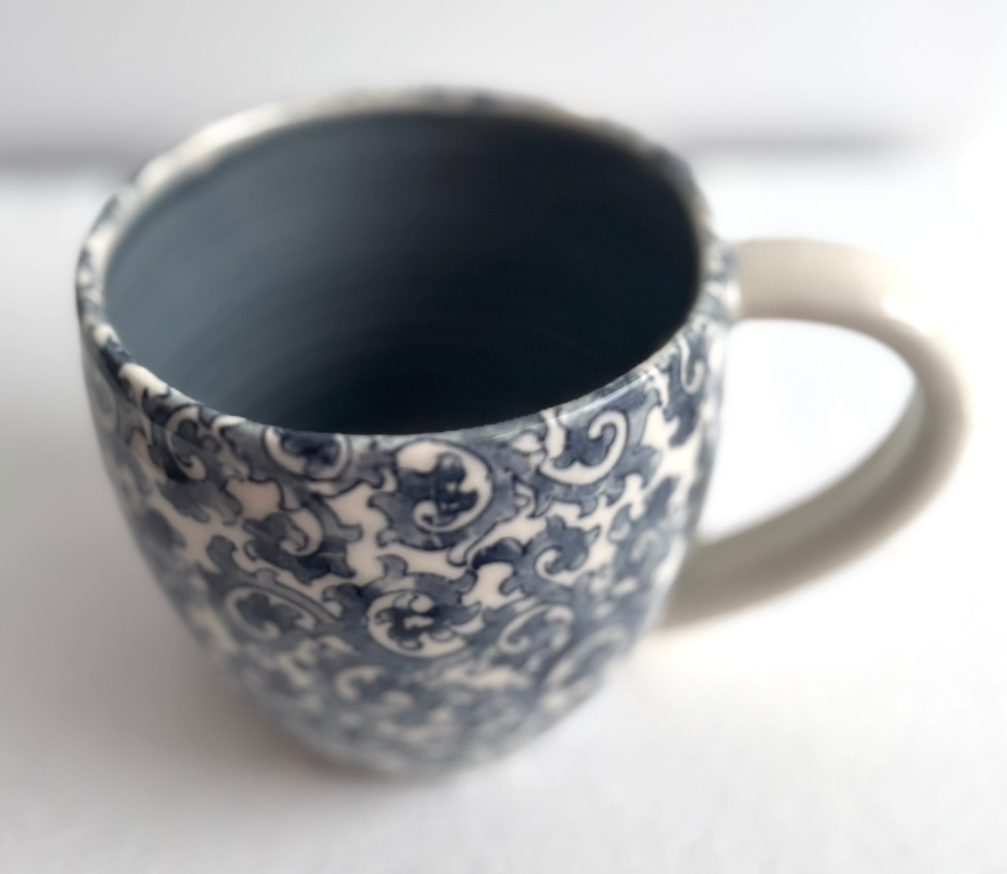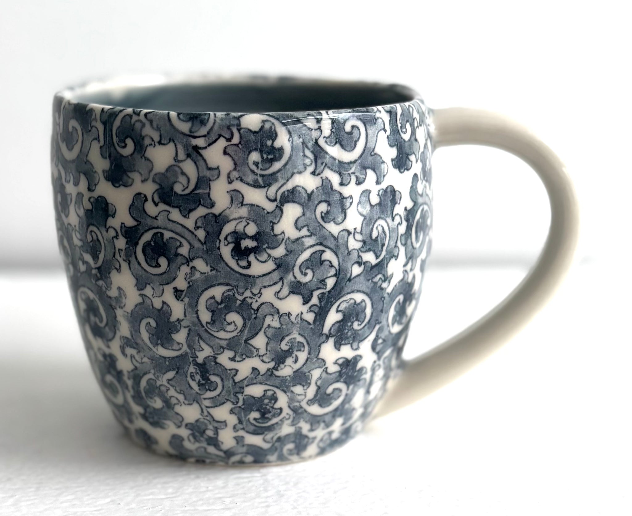 If you love a hand made pottery mug, you will love mine! I make my mugs out of a white porcelain clay body. I throw them on the potter's wheel, trim the bottoms with a foot ring so the bottoms are glazed as well. Each handle has been pulled and attached to the cup individually, so each cup has great character. Almost all of my handles are designed for two normal sized fingers. The exterior decoration is a transfer technique which is a silkscreening technique. The patterns are sealed permanently into the clay by the glazing process. A clear glaze is over the exterior, a blue denim glaze is a liner glaze