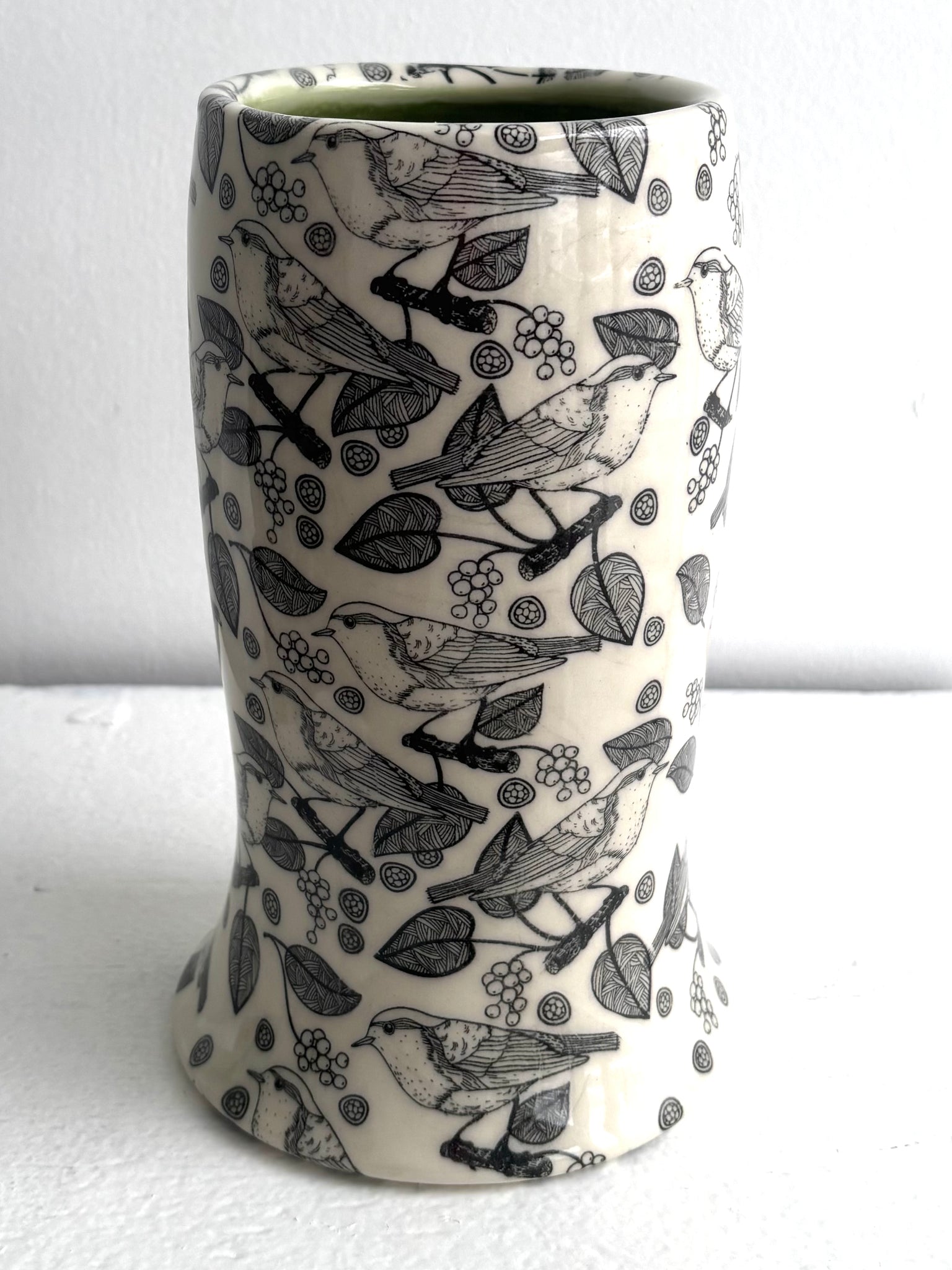I made this out of a white porcelain clay body. I threw it on the potter's wheel, trimmed the bottom with a foot ring so the bottom is glazed as well. The exterior decoration is a transfer technique which is a silkscreening technique in black of birds and grapes. The patterns are sealed permanently into the clay by the glazing process. A clear glaze is over the exterior of the piece, an olive green on the inside.